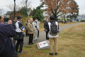 あいさつの後、史跡見学グループと体験グルーブに分かれてツアーガイドの方の案内で史跡内を見学しました。史跡公園内は、各場所に簡潔で分かり易い案内板(頑丈なコンクリート造り)が設置され、ガイドの方はこの説明文をベースに手持ちの資料などでガイドしてくれました。