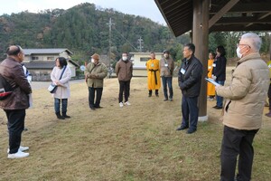 昼食をはさんで午後からは、恒川官衙遺跡では未発見の政庁のほか正倉院などが史跡公園に整備されている岐阜県関市の「弥勒寺官衙遺跡」を見学。関市教育委員会の方と関市文化財サポーター(ボランティアガイド)の方の出迎えを受けました。