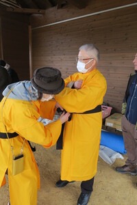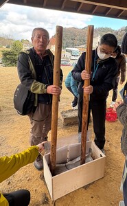 また、古代衣装の体験では実際に衣装を着て写真撮影をしていただき盛り上がりました。なお、ガイドの方もこの衣装を着ているので、体験者は抵抗なく着ることができるとのことでした。さらに、版築(はんちく)製作の体験(三重の塔などの基礎に使われる方法)では、実際に土を固めてみて当時の建築の苦労を体験しました。