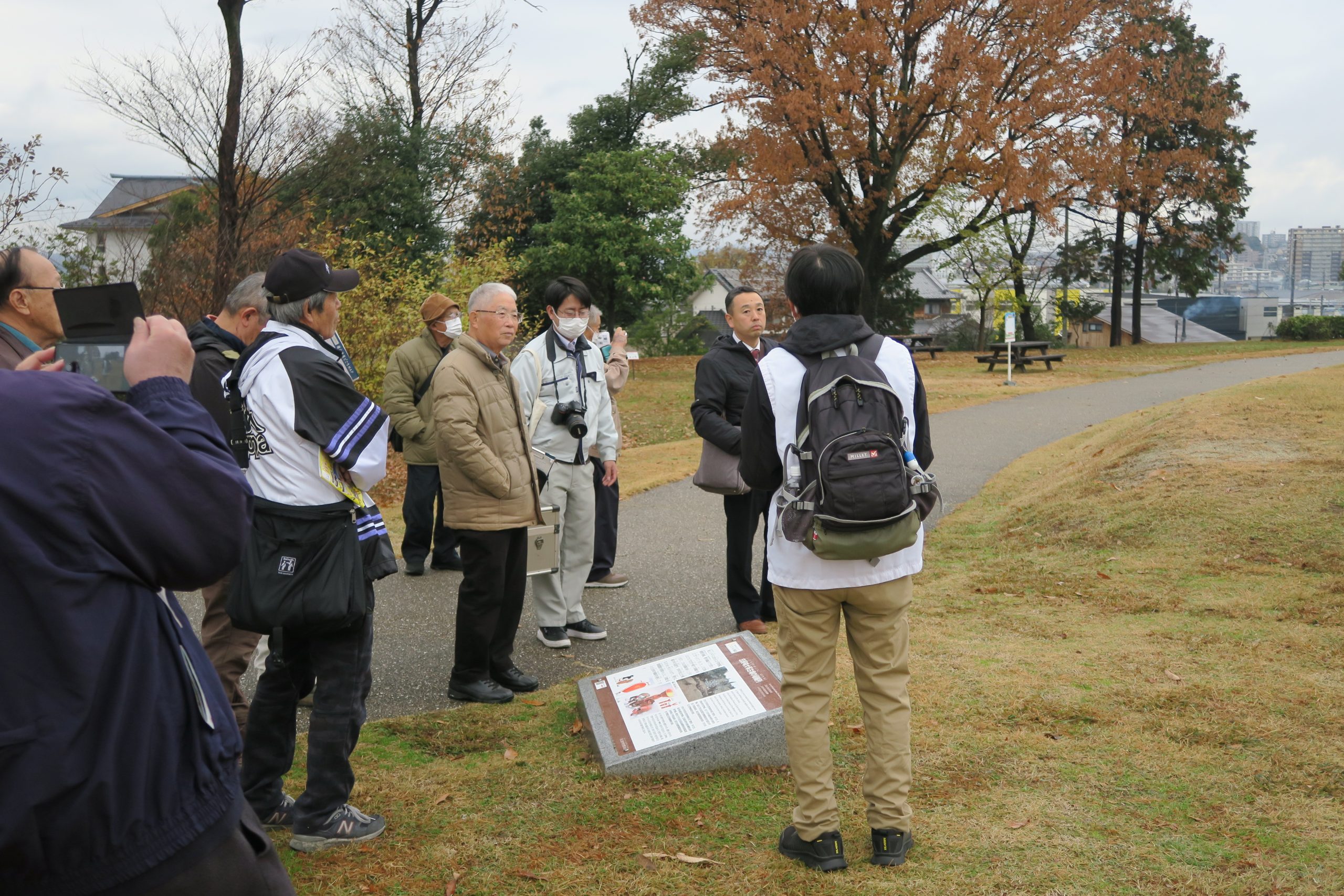 あいさつの後、史跡見学グループと体験グルーブに分かれてツアーガイドの方の案内で史跡内を見学しました。史跡公園内は、各場所に簡潔で分かり易い案内板(頑丈なコンクリート造り)が設置され、ガイドの方はこの説明文をベースに手持ちの資料などでガイドしてくれました。
