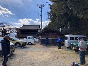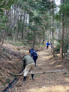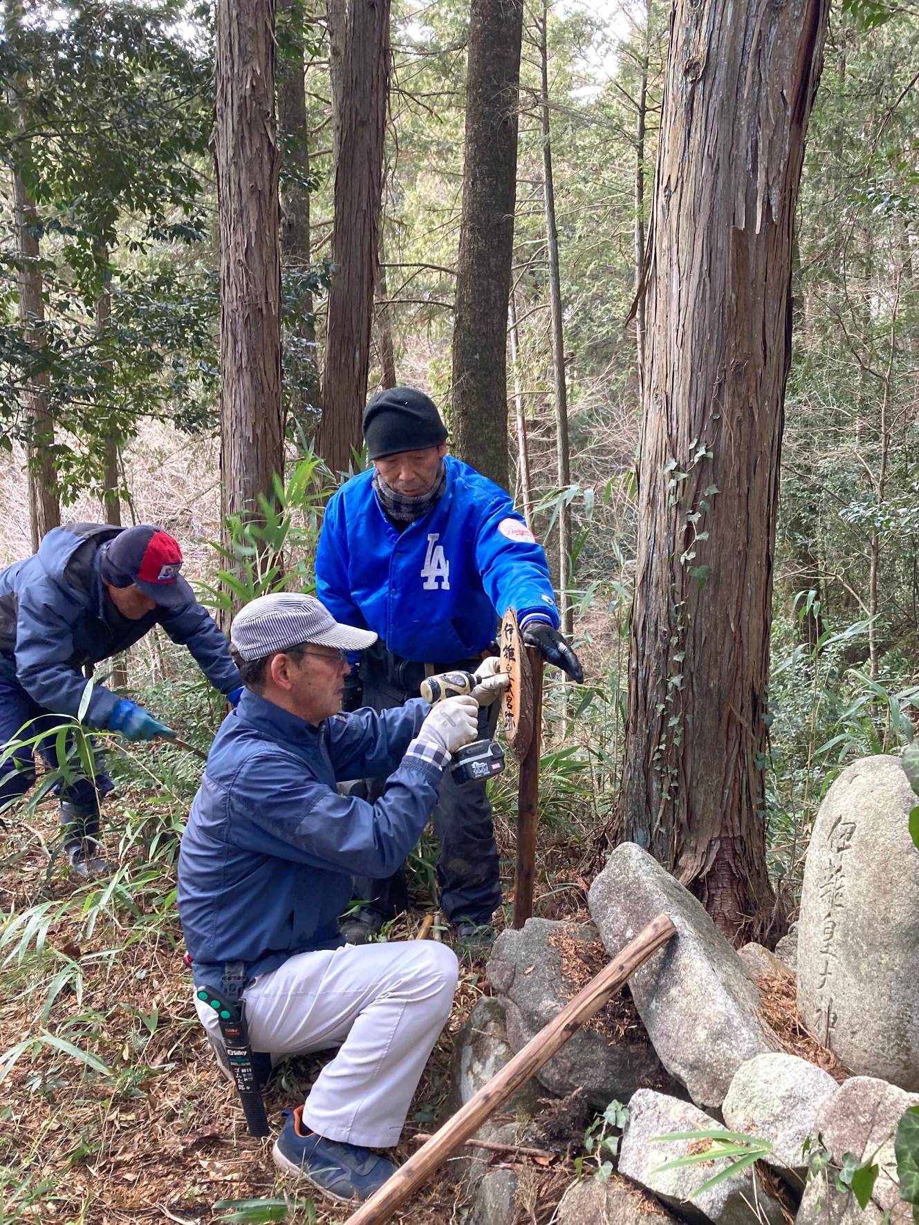 今年は、2月1日(日)の13時00分から2班のメンバー8名が麻績の里舞台桜前に集合。この日も寒気が入って風が冷たい一日になりましたが浅野班長からの作業指示の後、南本城の急傾斜地を登りながら排水溝の枯れ枝や土砂の除去、経年劣化した案内看板の交換作業を手分けして行いました。
